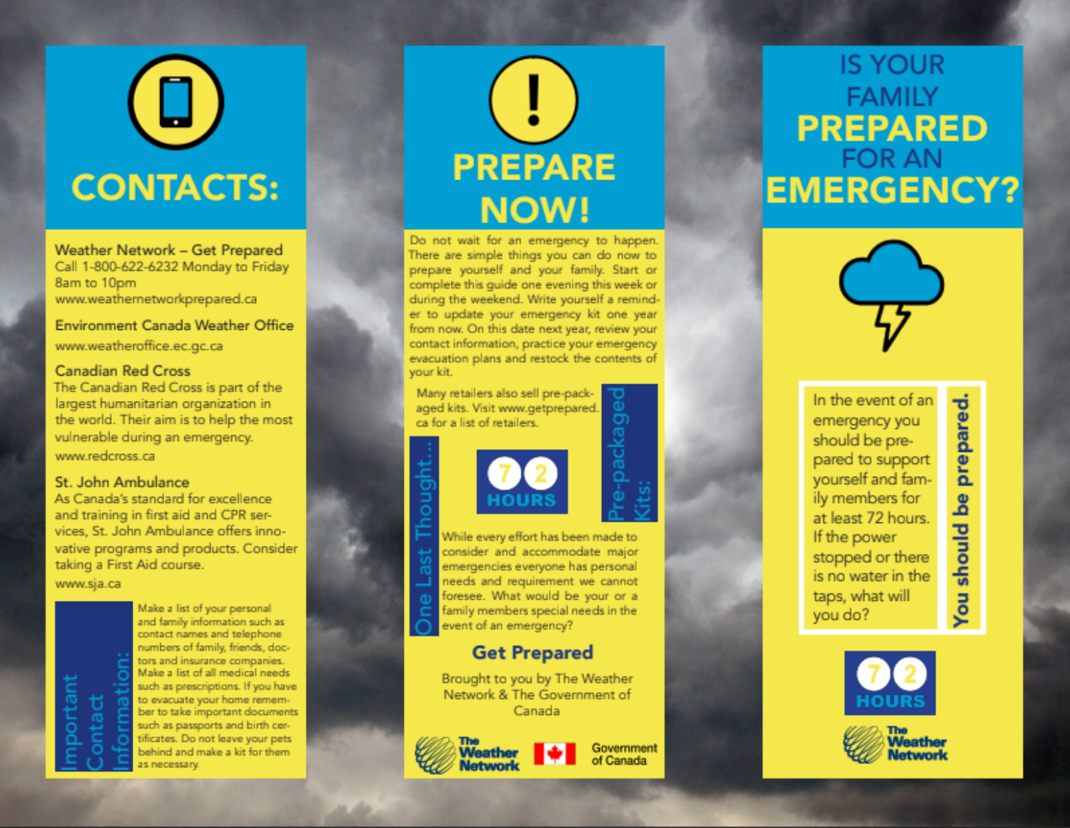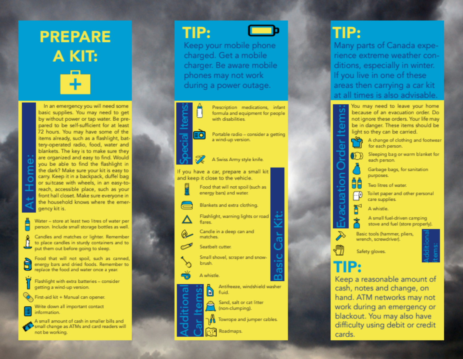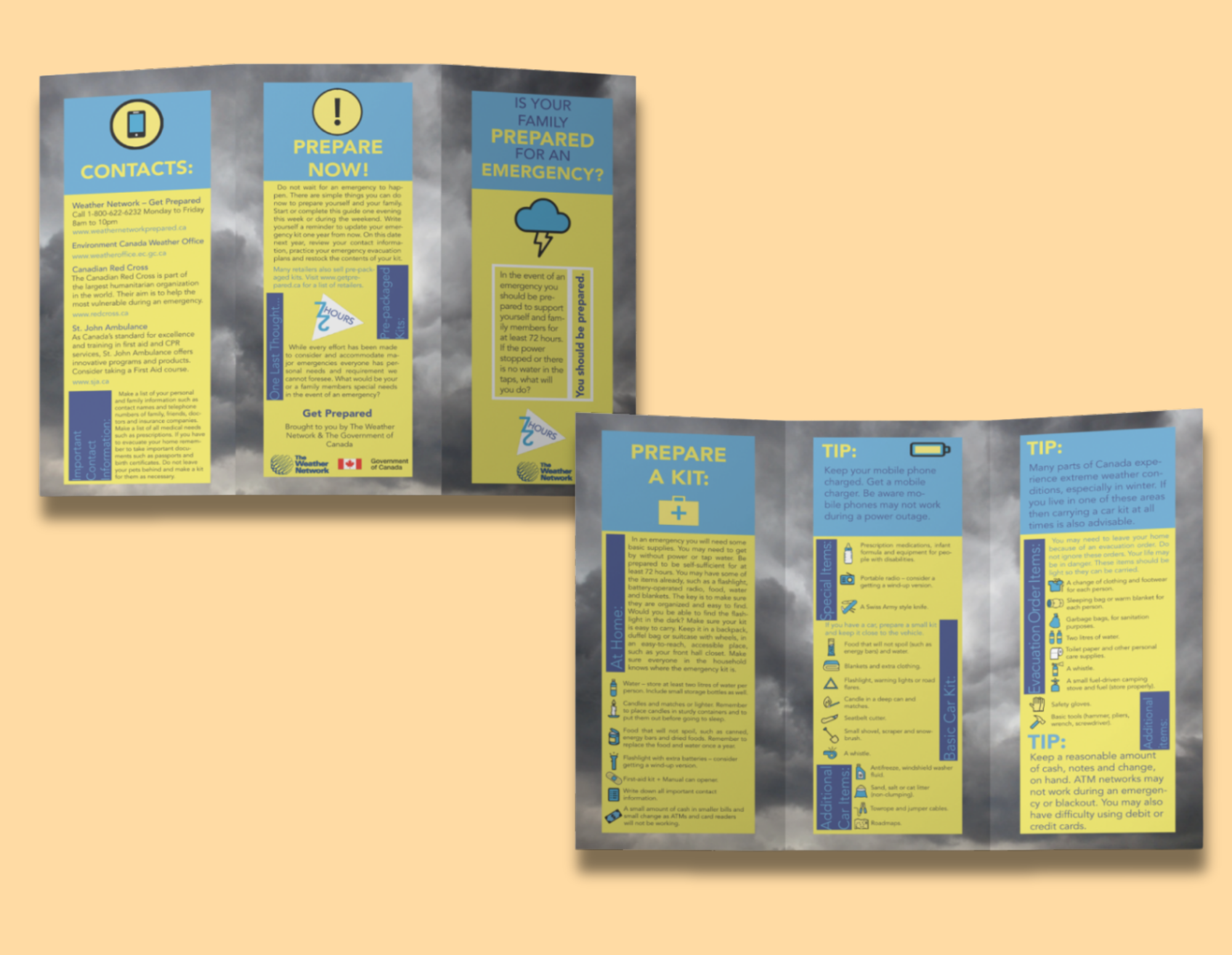 After a severe storm in 2012 that left most of Ontario without power for 3 days, The Weather Network and The Government of Canada decided they needed to educate civilians on how to stay safe in case of an emergency. As a second semester project, we were tasked with creating this brochure with a list of emergency supplies you should always have in case of an emergency, as well as helpful information and contact info. I went with a colour scheme of yellow and blue to match The Weather Network, as well as a stormy cloud background. I colour-coded the icons for the kits to match the overall theme.