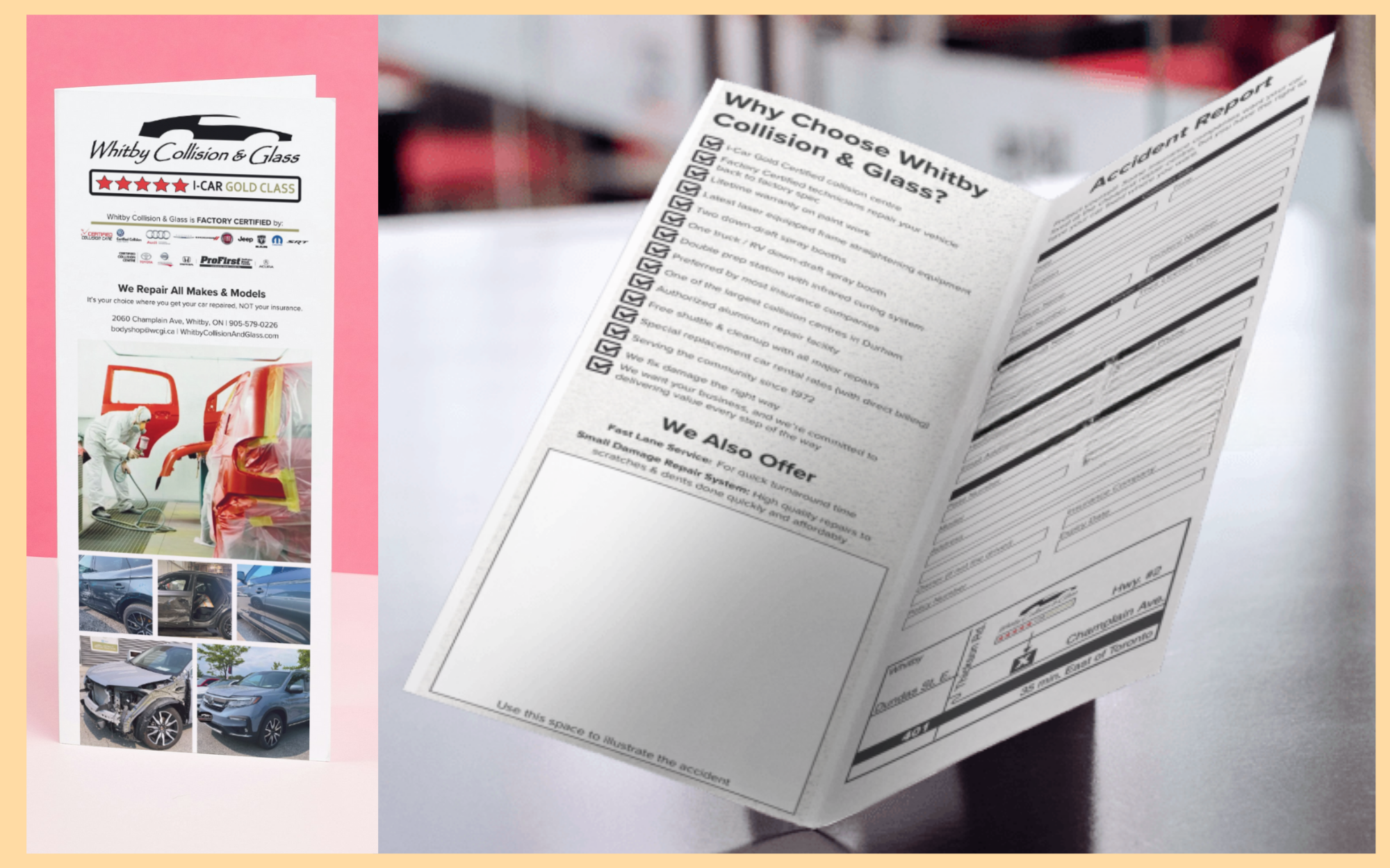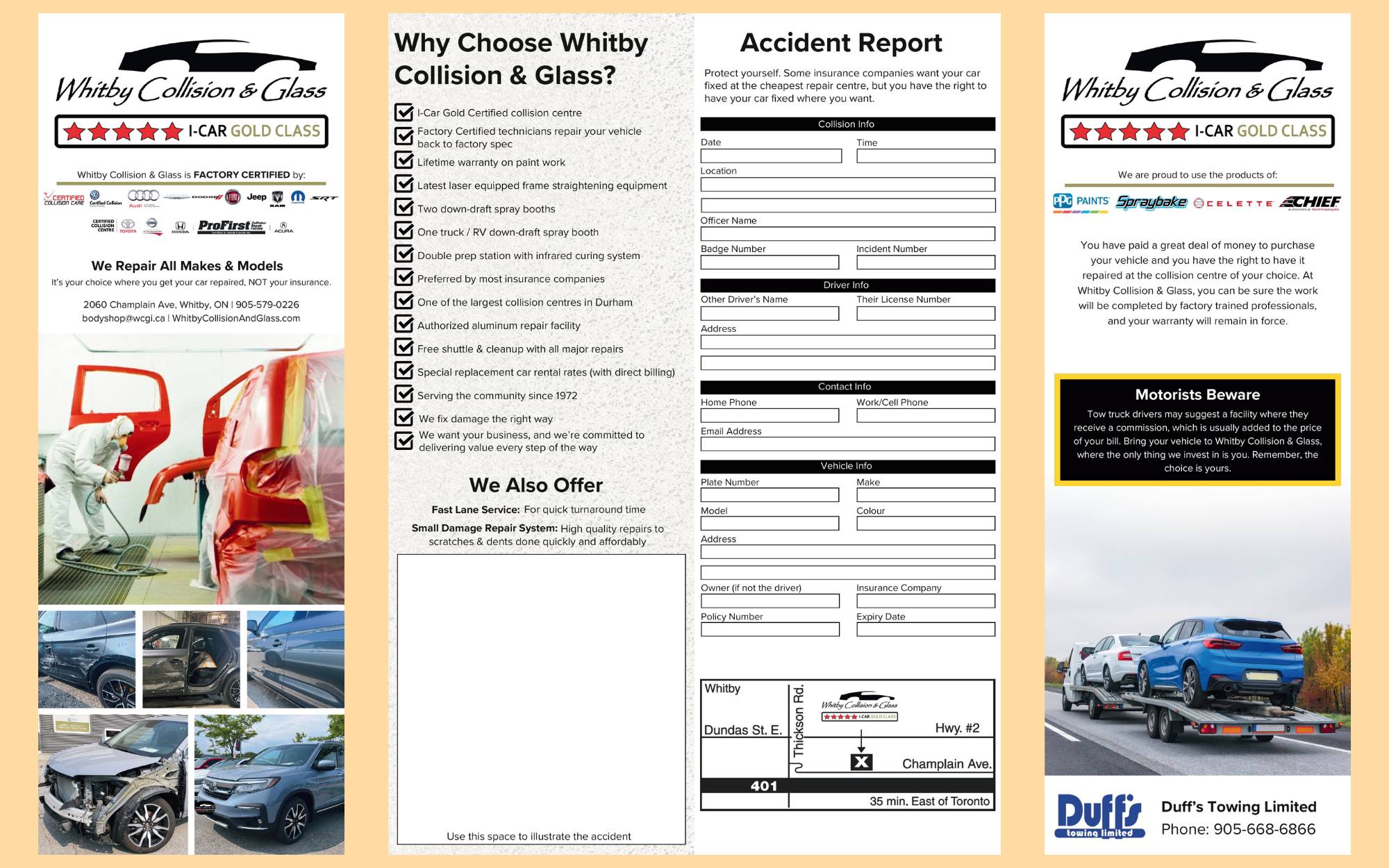 Whitby Collision & Glass (WCGI) is an autobody shop which is a part of the Owasco Group. We wanted to come up with a bi-fold brochure advertising our services and why people should choose us over elsewhere in the unfortunate case of a car accident. The insurance companies often want to send customers to a repair shop where they might get some kind of kick-back, but is not looking out for the customer. We inform people that they have the right to choose where to get their vehicle repaired.