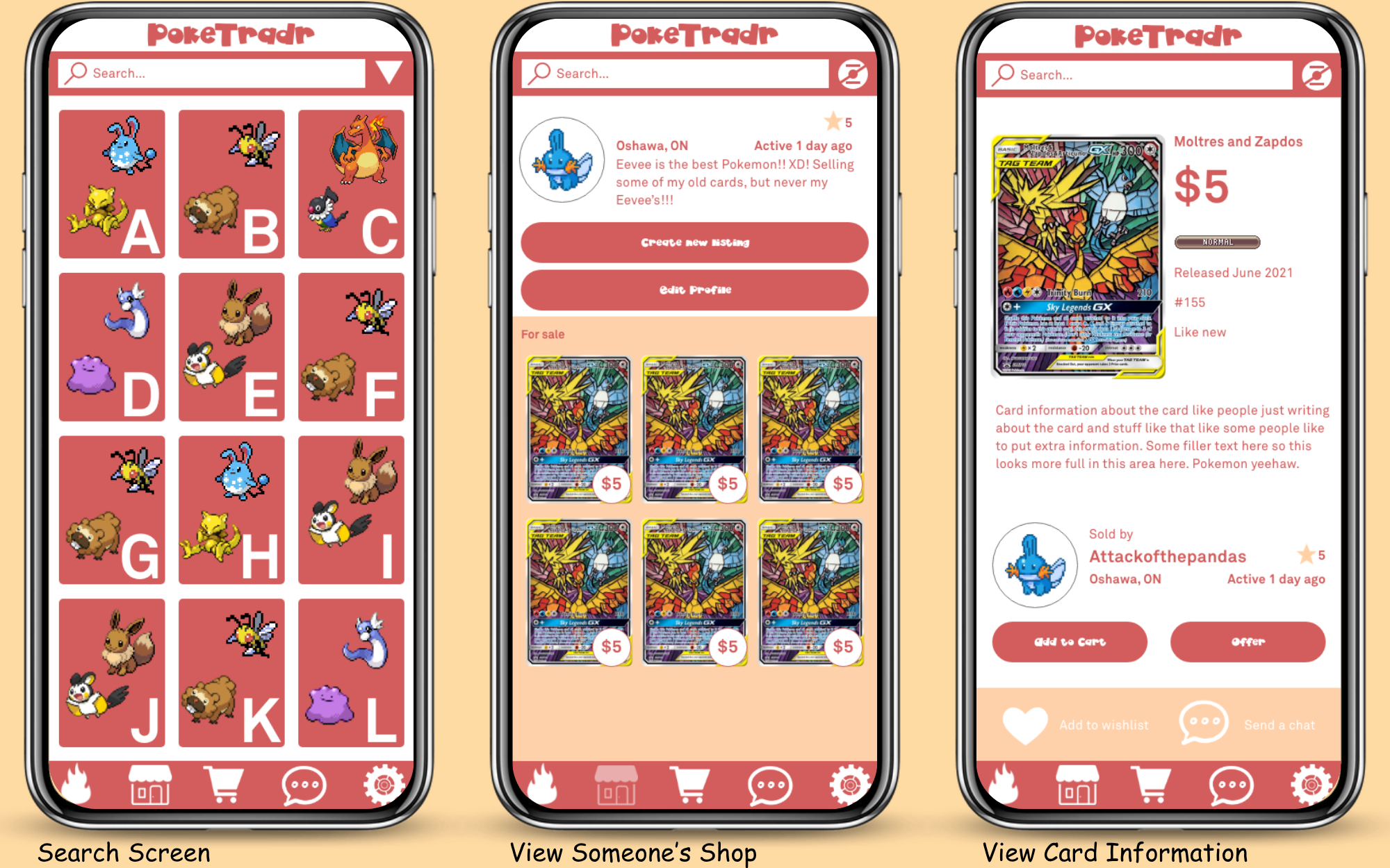 PokeTradr was an app idea that I came up with to streamline purchasing Pokemon cards. Although sites like eBay and Depop often have many Pokemon cards for sale from all around the world, PokeTradr streamlines this process and makes it easier to view and save cards. This was mocked up in Adobe XD, showing what the design of the various pages would look like if this app came into fruition. This makes it easy to see Pokemon cards at your fingertips and find the cards you want for your collection!