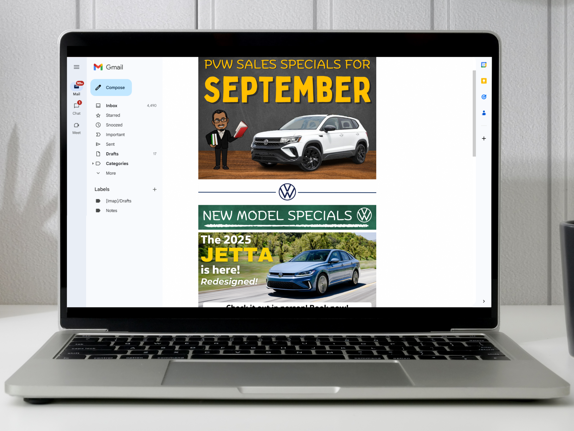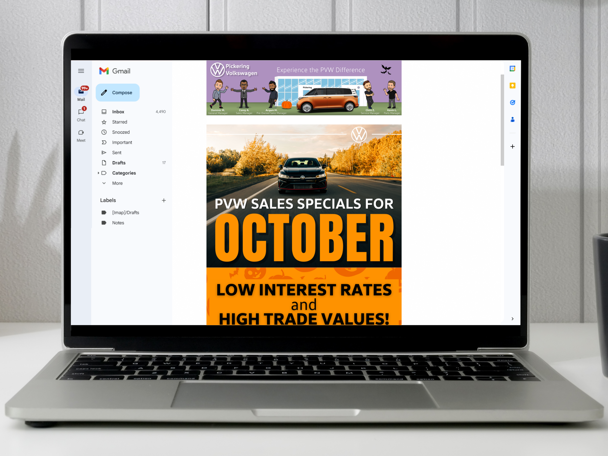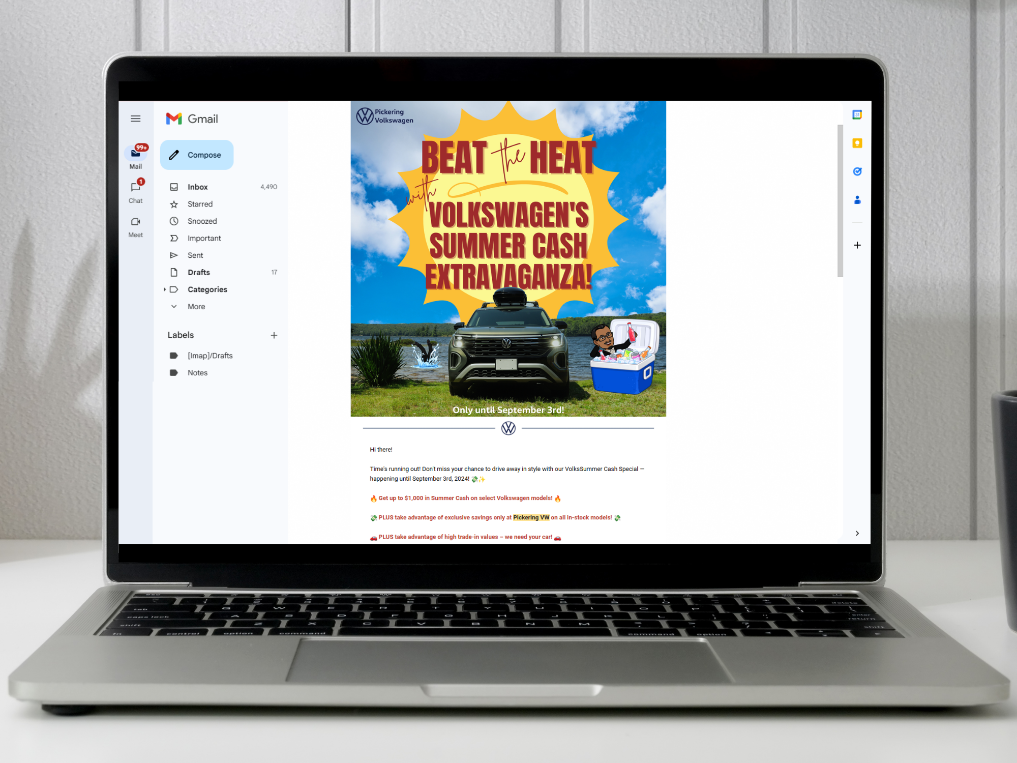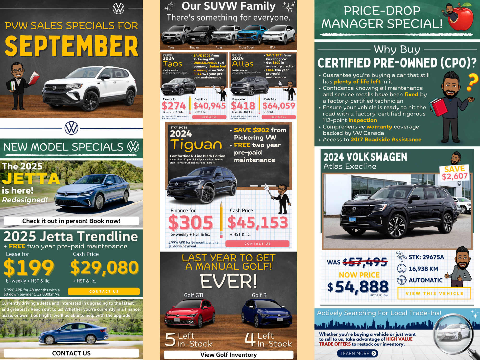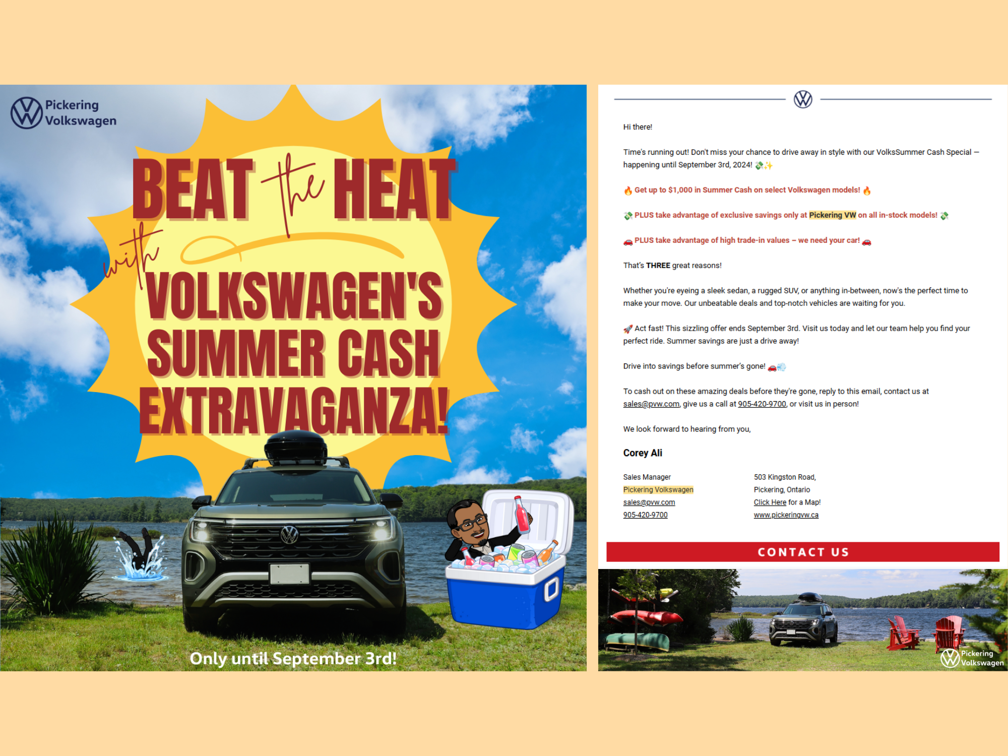 Halfway through the month of August 2024, Volkswagen Canada upped their incentives on select models, and to let customers know about these increased offers through Pickering VW, I came up with the VW Summer Cash Extravaganza email blast – a bold, eye-catching graphic up top to draw the viewer in, and our offers laid out in simple red bullet points. That way, the customer knows exactly what they get, before even reading the entire email. Short, simple, effective.