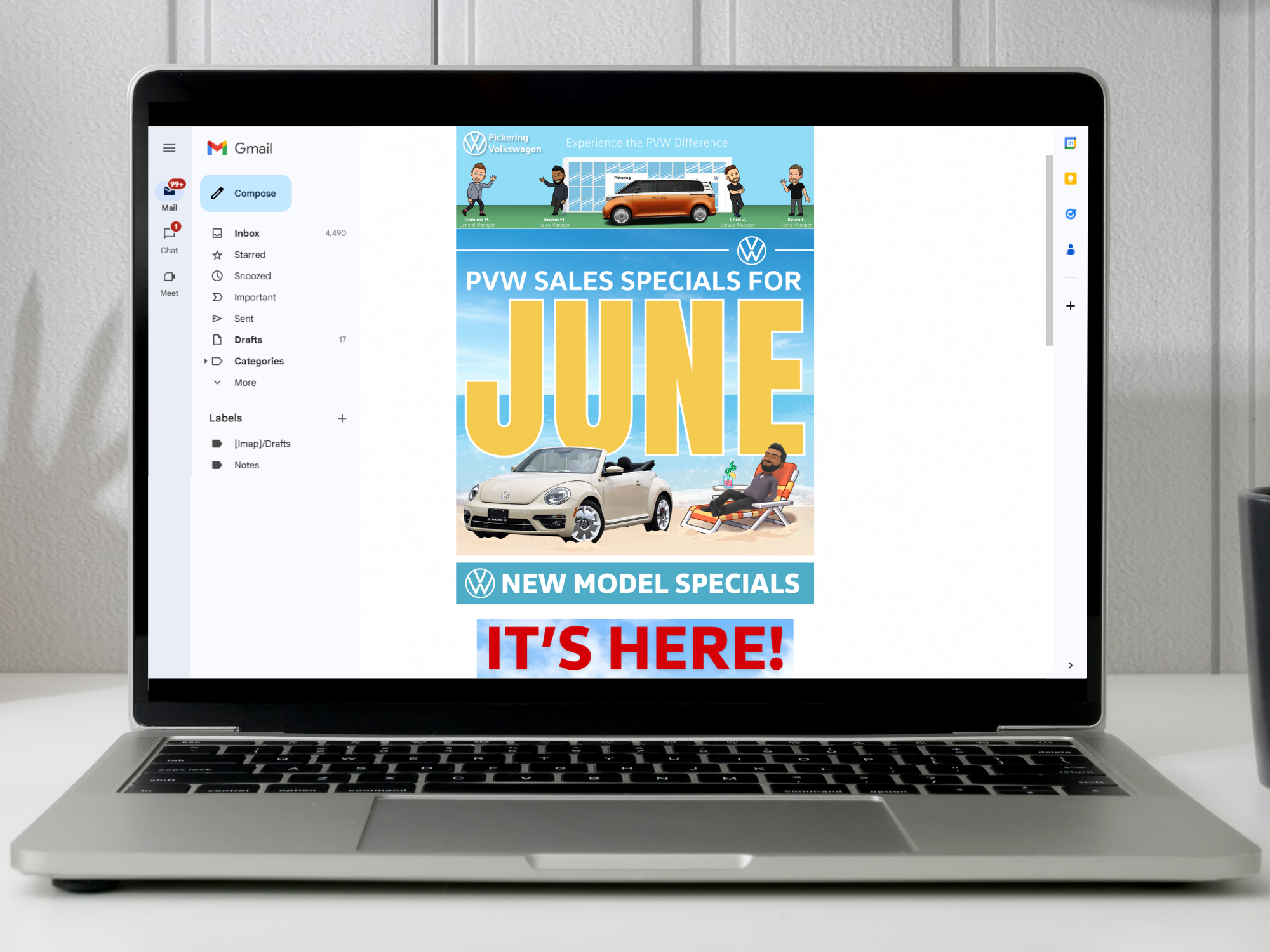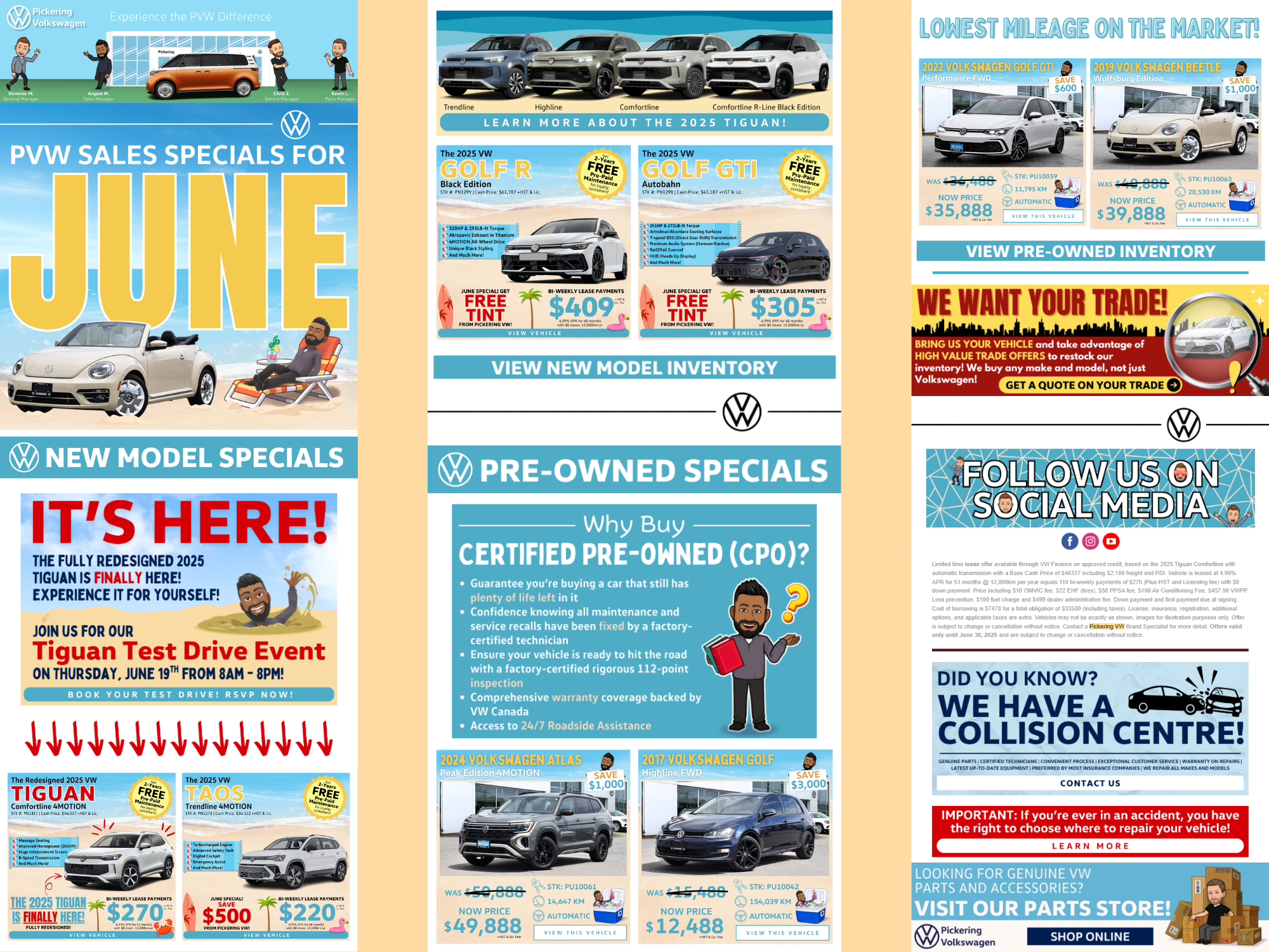 For my Pickering VW Sales Specials email blast for June 2025, I chose to go with a summer, beachy theme, and showcasing our pre-owned 2019 VW Beetle on the header, as that felt like a perfect summer-themed vehicle, as well as a hot commodity, considering VW had stopped producing the Beetle in 2019 it is now a rare find. We had finally gotten the newly redesigned 2025 Tiguan in stock, and wanted to highlight that throughout the blast so I chose to add some red into the mix to stand out.