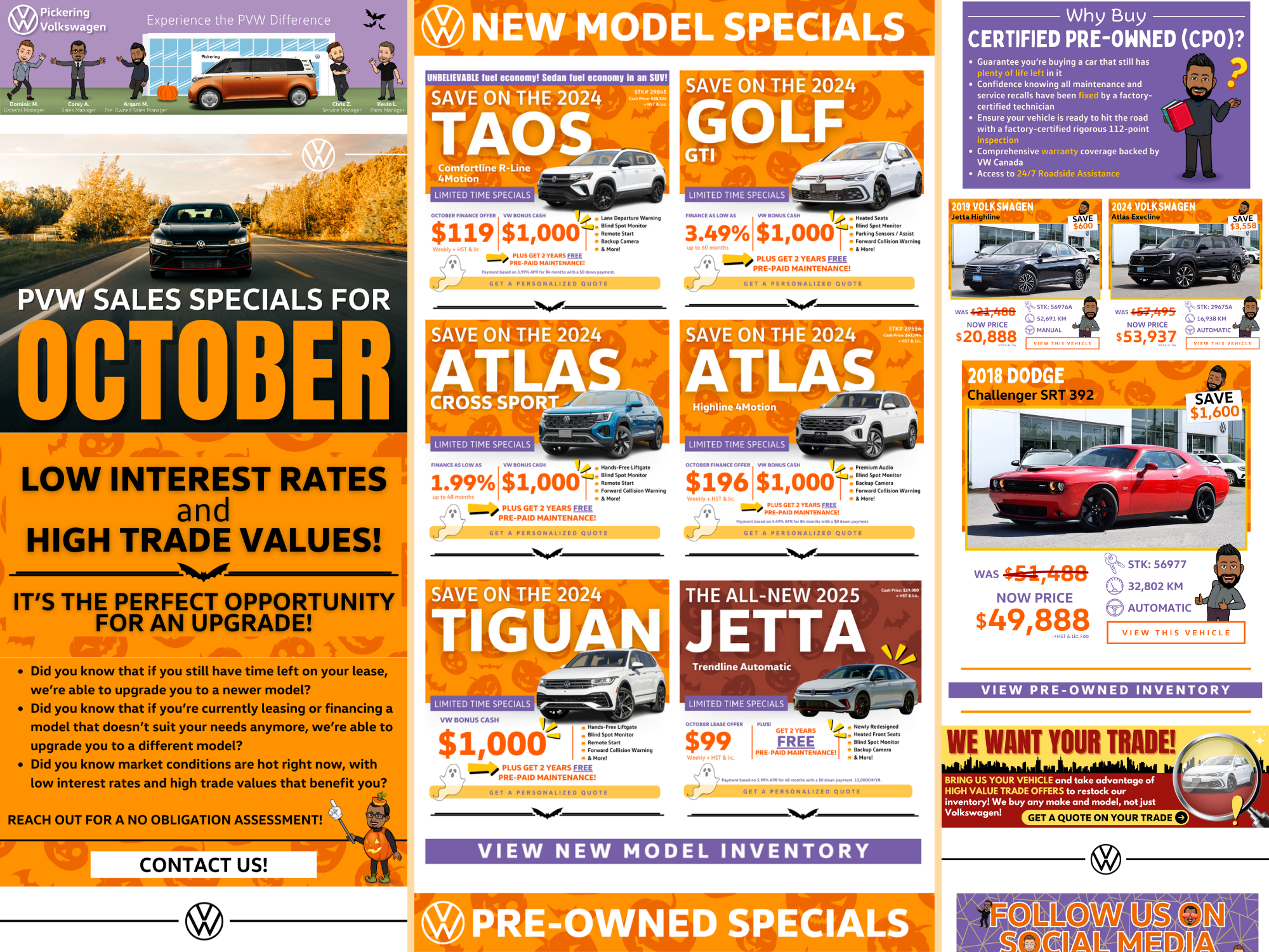 For Pickering Volkswagen’s Sales Specials for the month of October, I wanted to go with a Halloween theme to represent the month. I chose a colour-scheme of primarily purples and oranges, and a subtle yet striking Halloween-patterned background. For our top image, introducing the management team with their bitmojis, I stylized that to be a bit more ‘spooky’ as well. Even the exclamation marks highlighting the savings for each vehicle are designed to look a bit like candy corn.