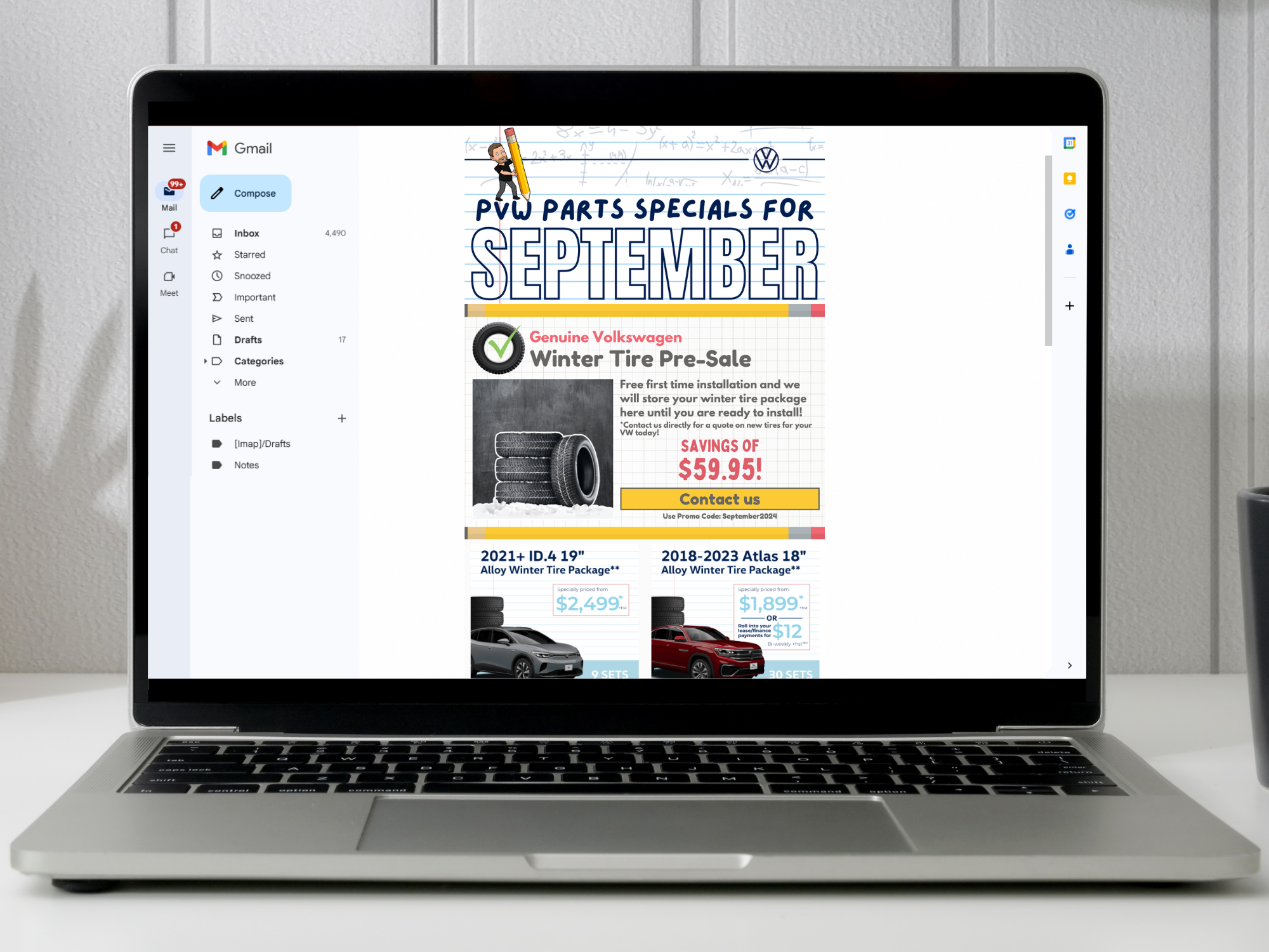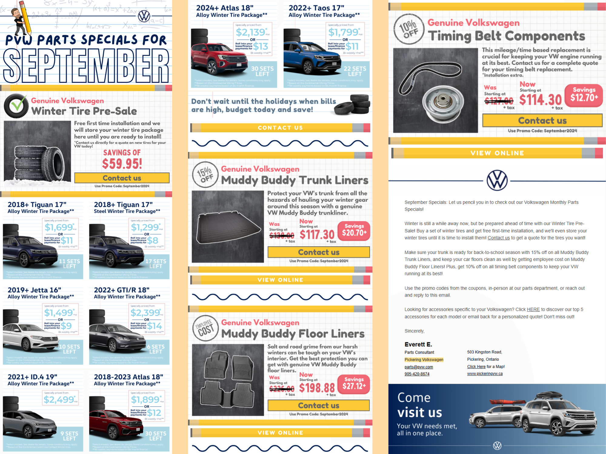 To showcase Pickering VW’s parts specials for September 2024, I chose to use a back-to-school theme similar to my Sales email I have created for them. I kept it in a similar branding while also rebranding to keep it unique and its own entity. I used a subtle paper-lined background and thick fonts to give it a ‘hand-drawn’ touch. We really wanted to showcase our Winter Tires, and get people thinking about it early, so we emphasized a Winter Tire Pre-Sale, where the winter tire packages section take up a third of the email blast. I even made the buttons look like pencils.