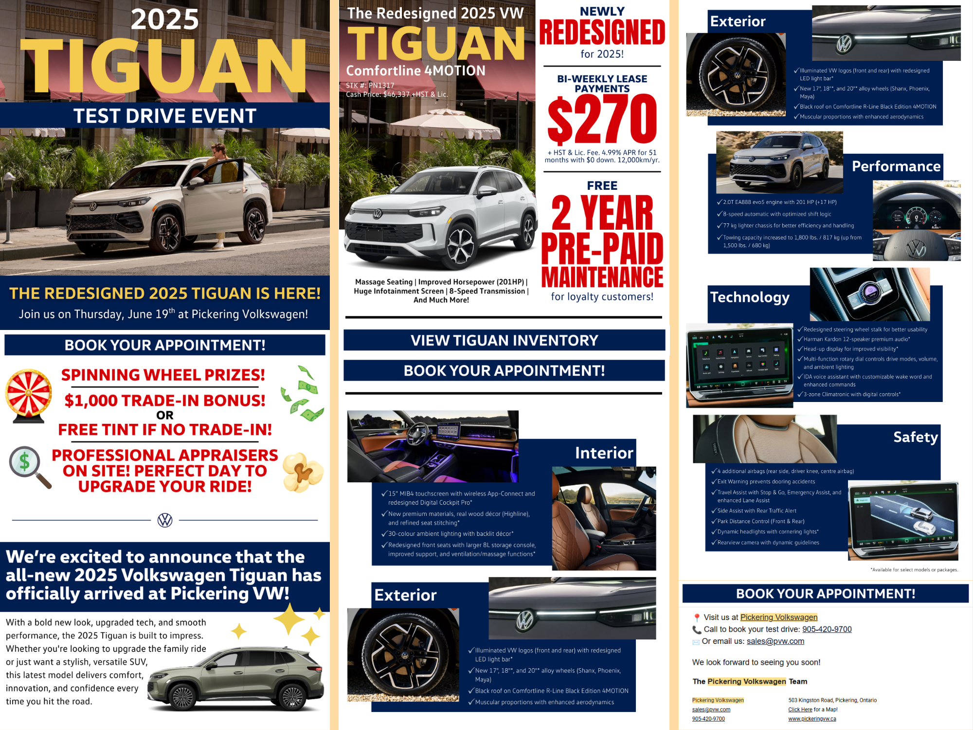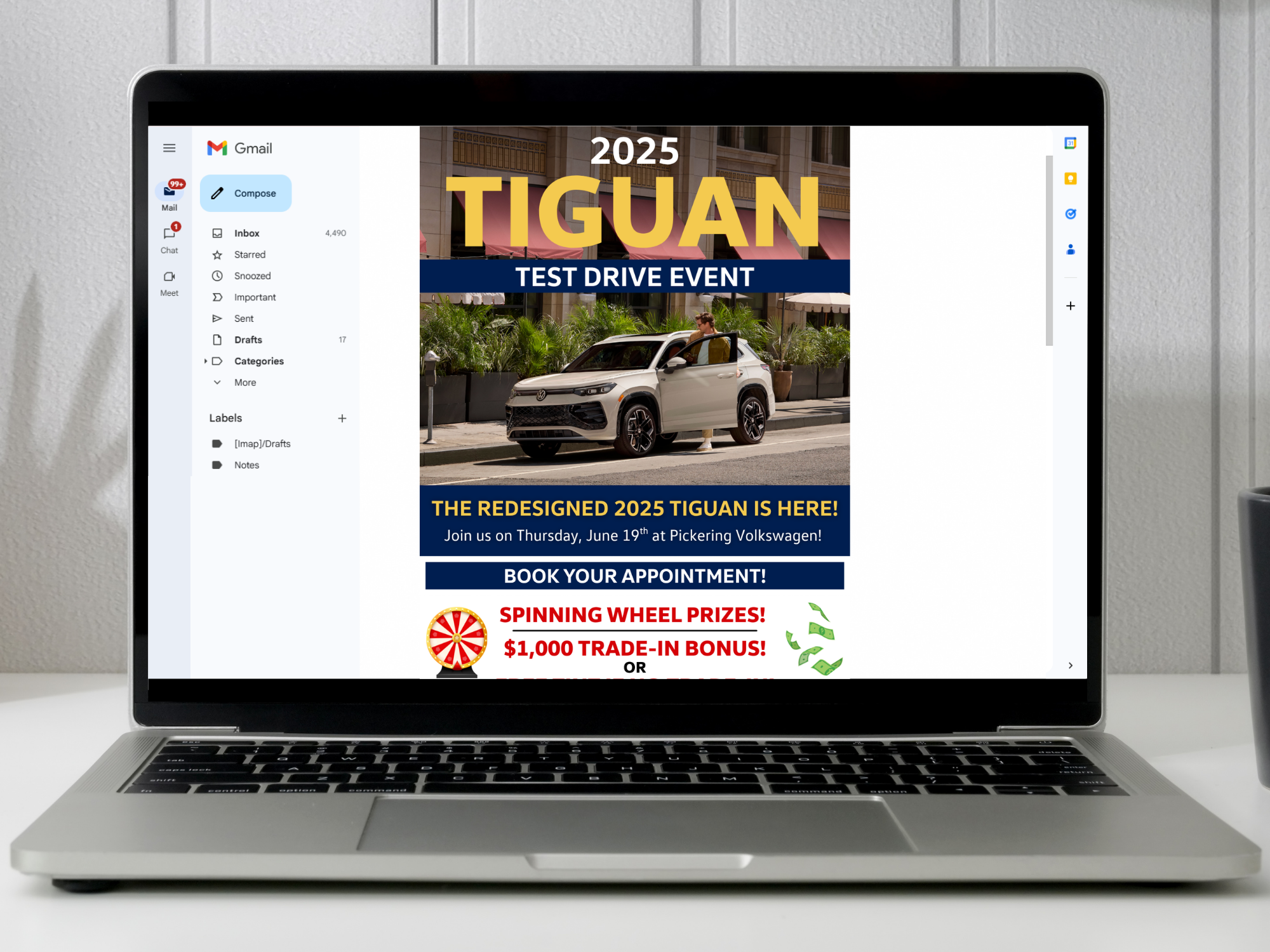 For Pickering VW, the 2025 Tiguan was a big deal – it had a complete redesign for both its exterior and interior, adding a plethora of new features. To showcase all these changes, and so customers could experience them hands-on, we chose to run a Tiguan test drive event. This was my email blast made in Constant Contact, sent out to our entire customer list, inviting customers to the event. I chose to use a lot of lifestyle images to really showcase the difference of the Tiguan in real life.